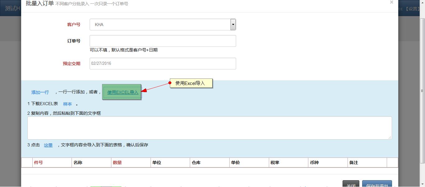 以上几个功能都支持Excel导入资料,方法完全一样(除了仓库盘点稍有不同,具体请看相关章节)。下面我们以下订单为例来演示如何使用Excel导入。