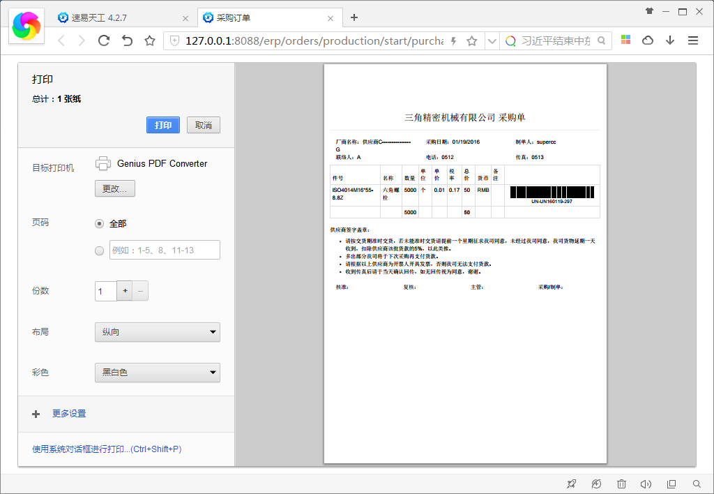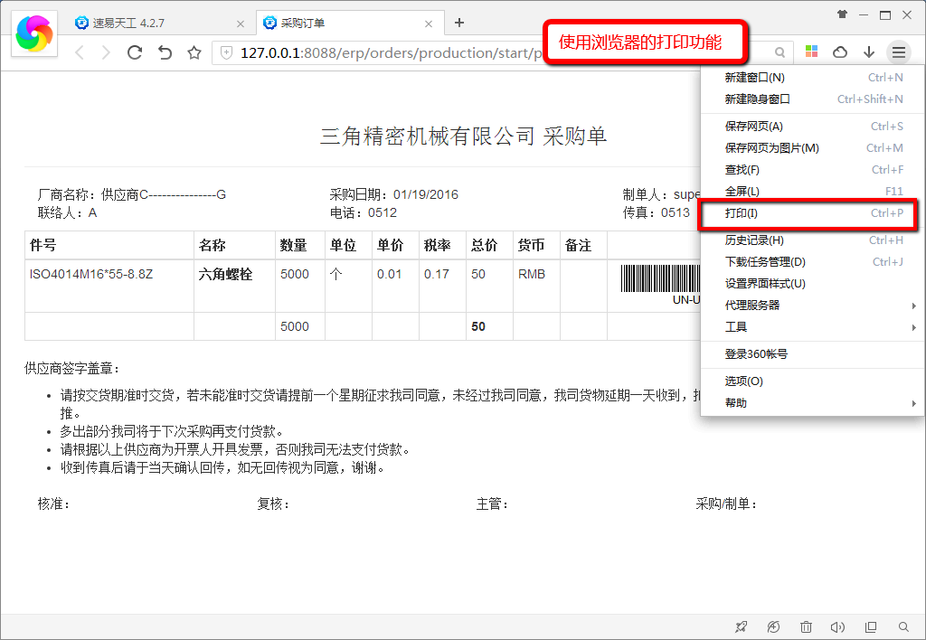 打印表格是常见的操作。由于B/S结构,系统本身会生成可打印的页面,使用浏览器的打印功能即可打印表格。比如典型的打印页面SOP,教程后面会讲到。打印都是基于浏览器的,使用浏览器的打印功能即可。