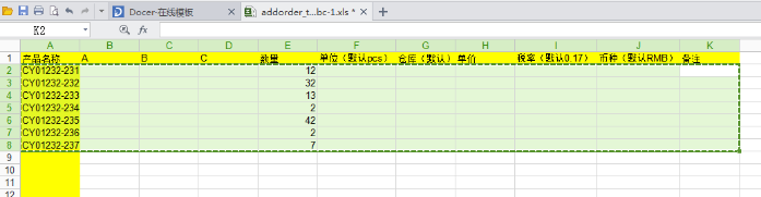 - 按需要填写。注意第一行是标题。黄色部分是必填的(这里是“产品名称”)。下订单时数量一般也是必填的,否则系统默认填1。
