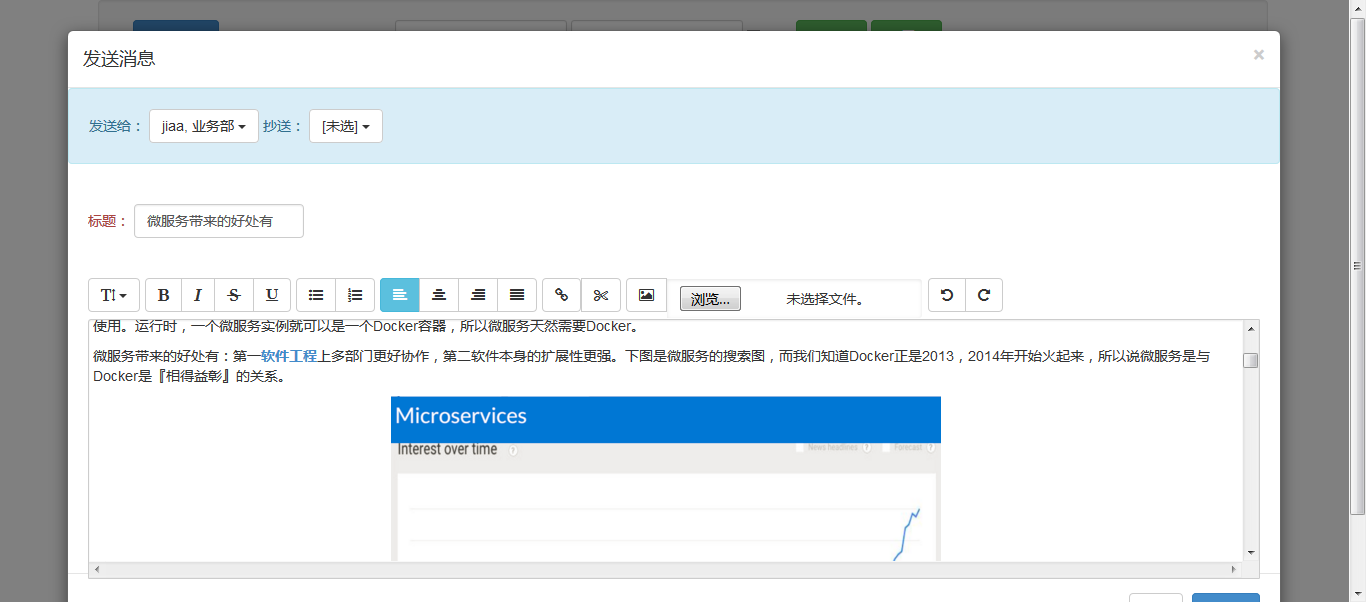 发送人和收件人都是系统内的用户,只有用户之间可以发送邮件。发送内容可以完全按照普通的在线编辑器一样,有一定的格式,可以插入图片,复制图片。
