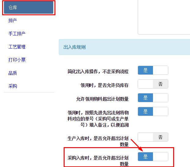 仓库的设置,将生产入库时,是否允许超出计划数量的状态切换成“是”,如下图