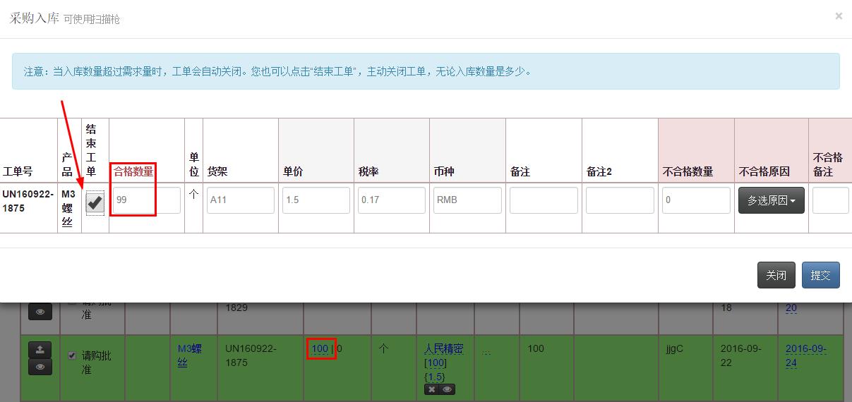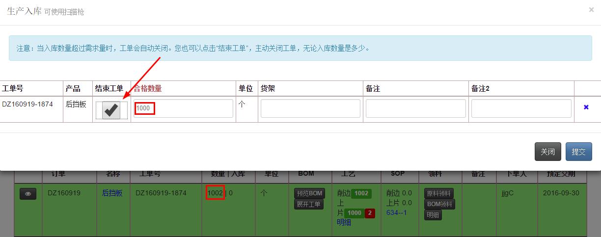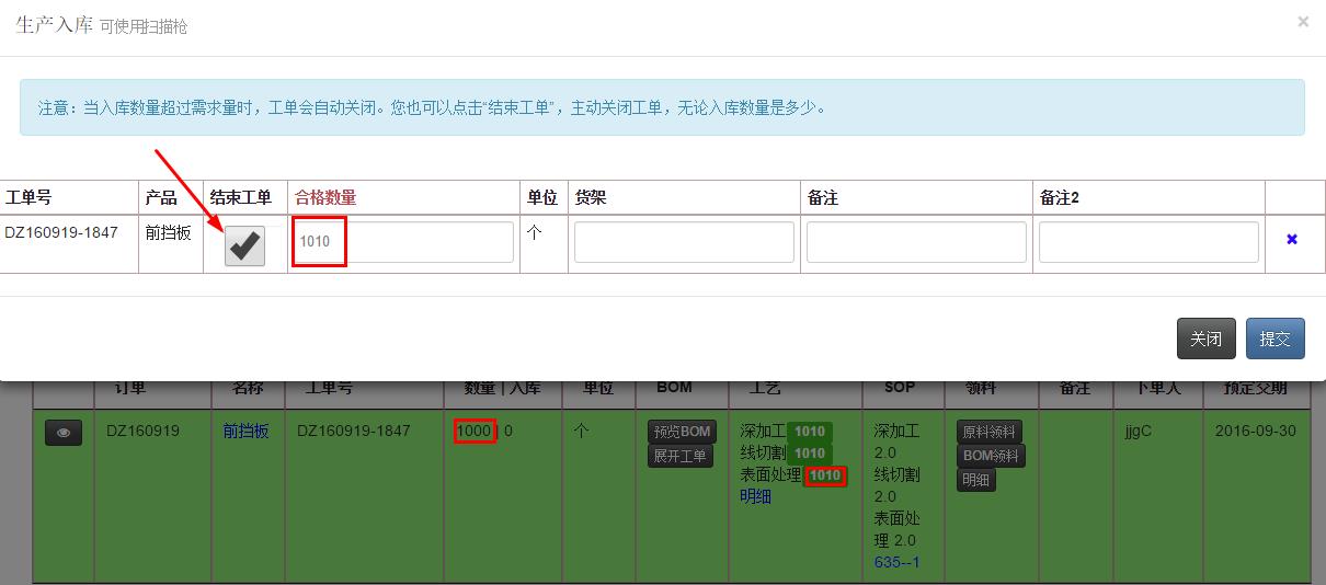 - 最后在成品入库时,入库数量多于计划数量的情况(如下图)同样要在结束工单上打上√,表示手动结束工单。(注意这种情况合格数量需要根据实际入库数量情况人工修改的)