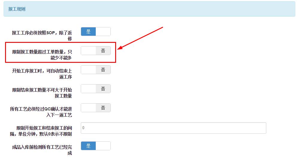 再找到报工规则,确保红色框内的开关是在“否”的状态,如下图
