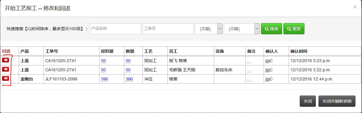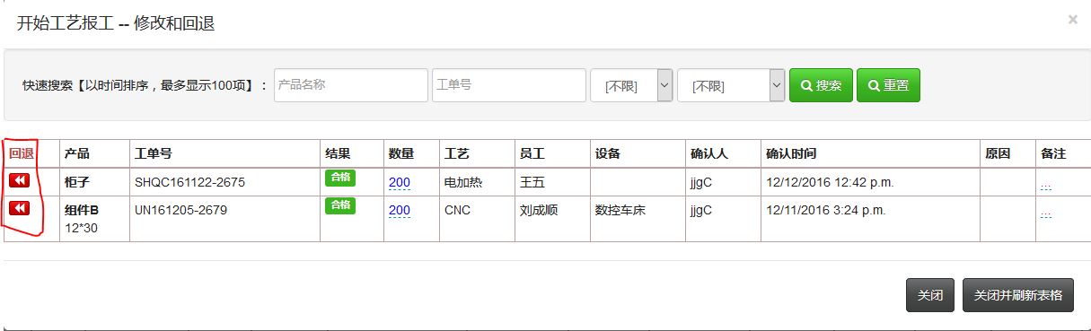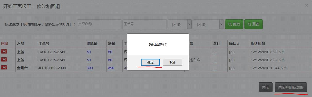 点击后会出现确认,点击确认后,再点击关闭并刷新表格就回退成功了,如下图