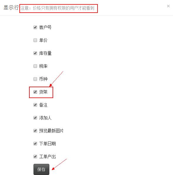 • 点击“显示列”后,会出现选择页面,选择需要显示的,把它√选,如下图。注意价格只有拥有权限的用户才能看到的。