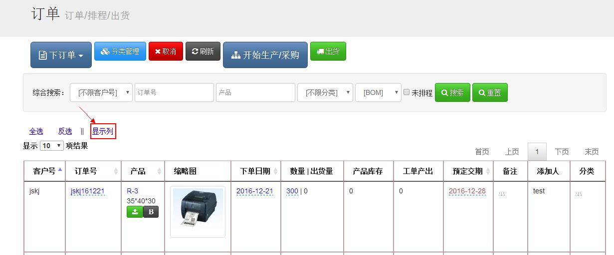 • 首先进入订单页面会看到有个显示列,如下图