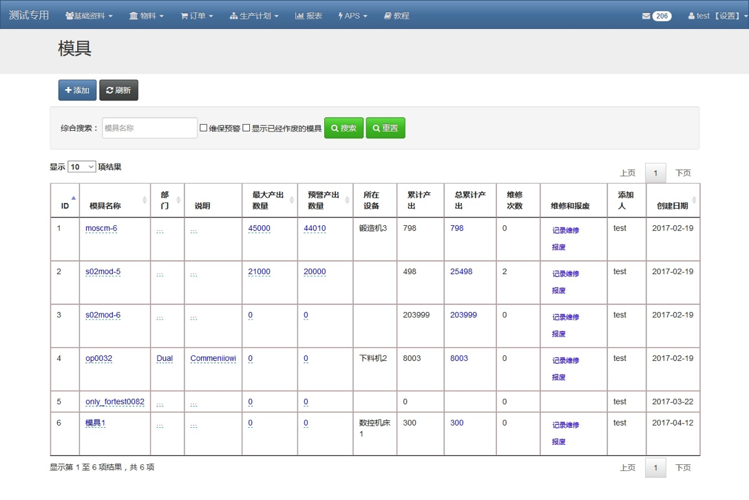 该功能块能根据报工的数据,自动统计每个模具的累计产量,维修记录,维修次数,总体寿命。这些统计不需要人工操作,仅仅根据平时工人的生产报工即可自动录入、统计、完成。