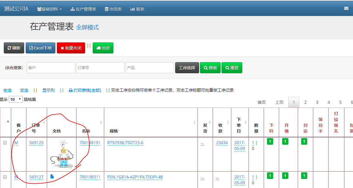 速易天工V3簡易生產(chǎn)管理軟件。每一行都是一條生產(chǎn)計(jì)劃。下計(jì)劃的人可以上傳照片,比如產(chǎn)品的簡圖,圖紙等等,反正大家習(xí)慣什么上傳什么。車間可以通過縮略圖去查看制造的東西是什么,能80%防止做錯東西的發(fā)生。點(diǎn)擊的時候能放大圖片。