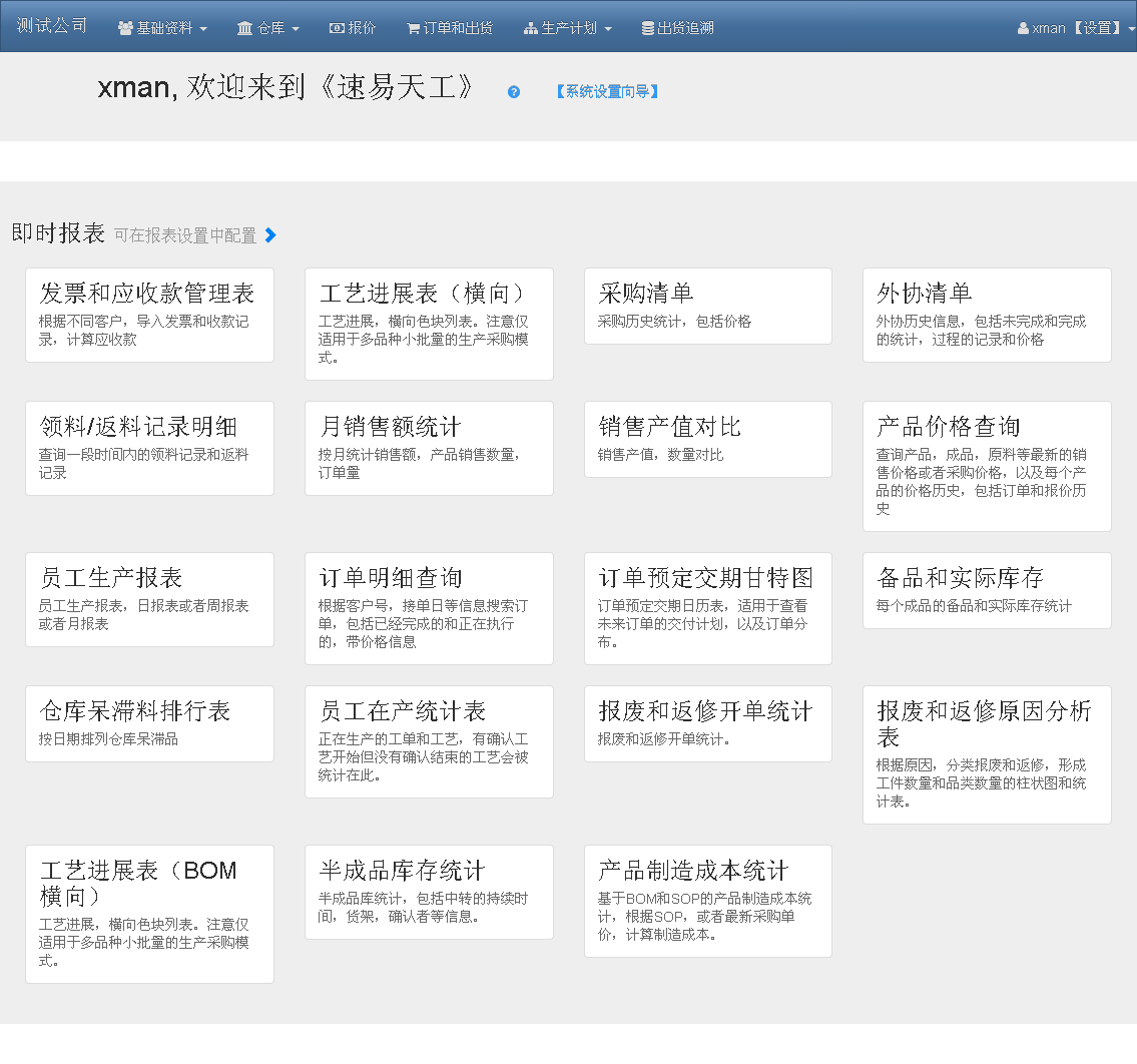 - 員工生產報表:統計一段時間內員工完成了哪些工作,數量,花費的預估時間和實際時間,確認者等等信息。