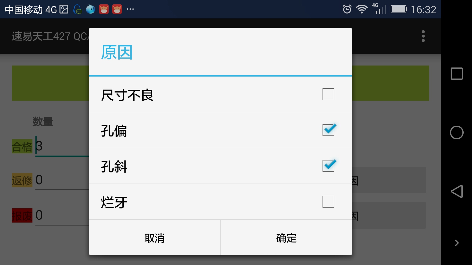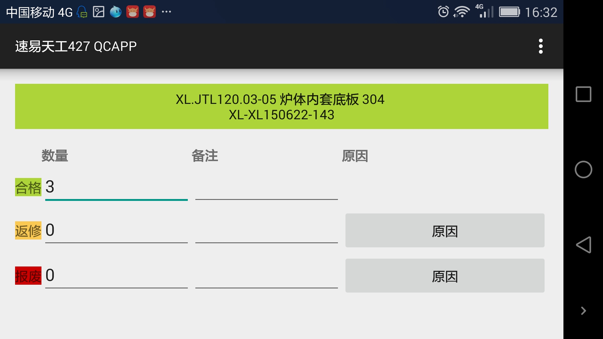 QC可以填入检测结果。绿色代表合格,黄色返修,红色报废。点击上面的绿色按钮即可提交数据,完成检测作业。