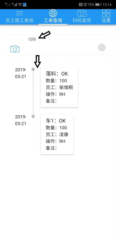 点击员工报工查询,首先选择要查询的日期段,再选择工人名字,最后点击查询,就会显示出这个工人扫码报工的记录明细。