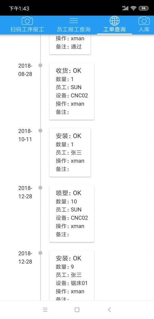 報工,就是工序做出來后用app掃碼的方式,記錄工序的生產結果,比如數量,誰做的,合格多少報廢多少返修多少,還有什么異常信息,這些內容可以通過掃碼后的記錄框錄入,便于追溯。通過二維碼,可以在事后,通過手機查詢一個產品或一個生產批次的過程。