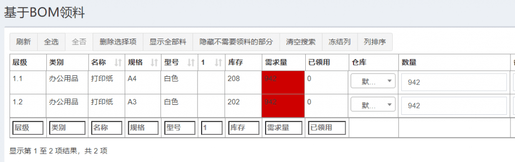 1、有了BOM管理模块,新建的订单导入到BOM,员工通过BOM信息数据,调用或者采购物料,1~2个小时就能完成领料环节,节省了大量时间,提升100%效率。