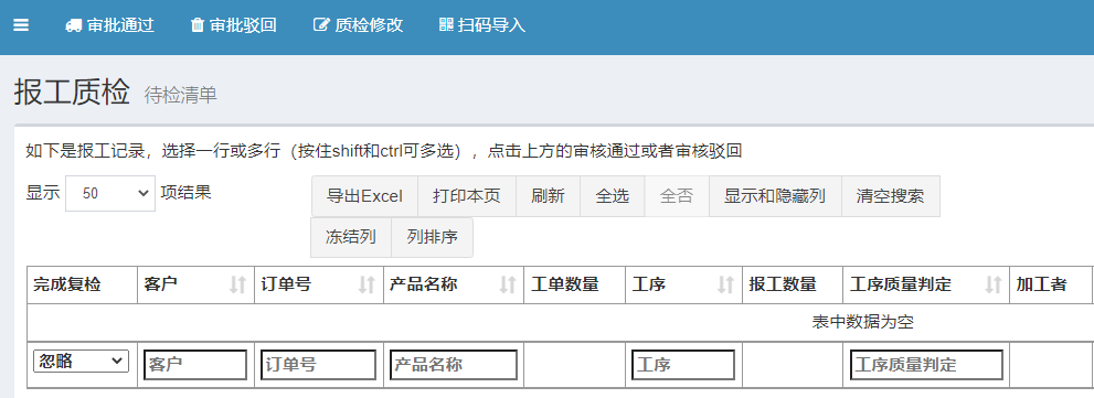 4、质检报工模块,管理人员可通过扫码判定工人加工质量,是否不合格、报废。员工合格率提升,降低了因报废而产生的浪费,同时也省去了每月花费人力人工制作报表的时间。