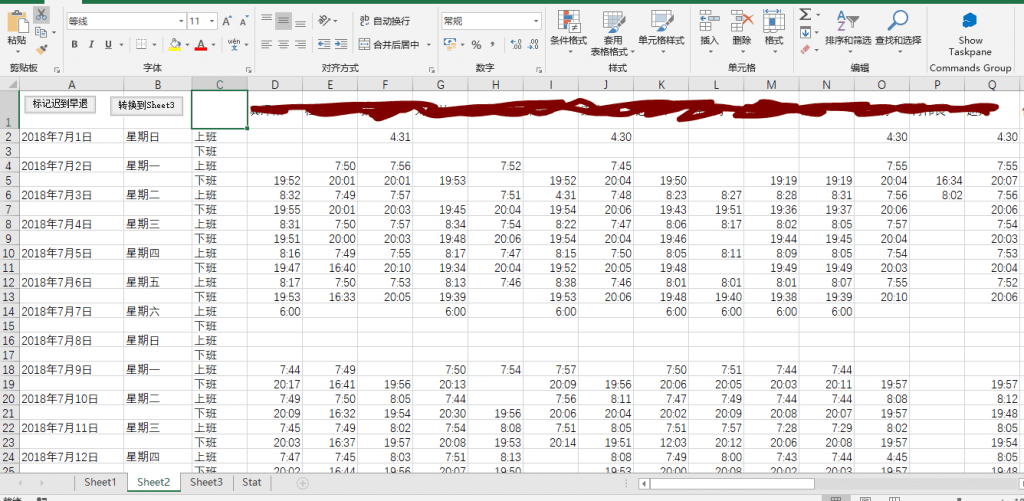 主要sheet2呈現的是員工打卡情況。實際上,會有一些漏打卡的情況,單軟件系統本身無法分辨到底是漏打卡,還是誤操作,還是真的缺勤,所以必須要人工補。