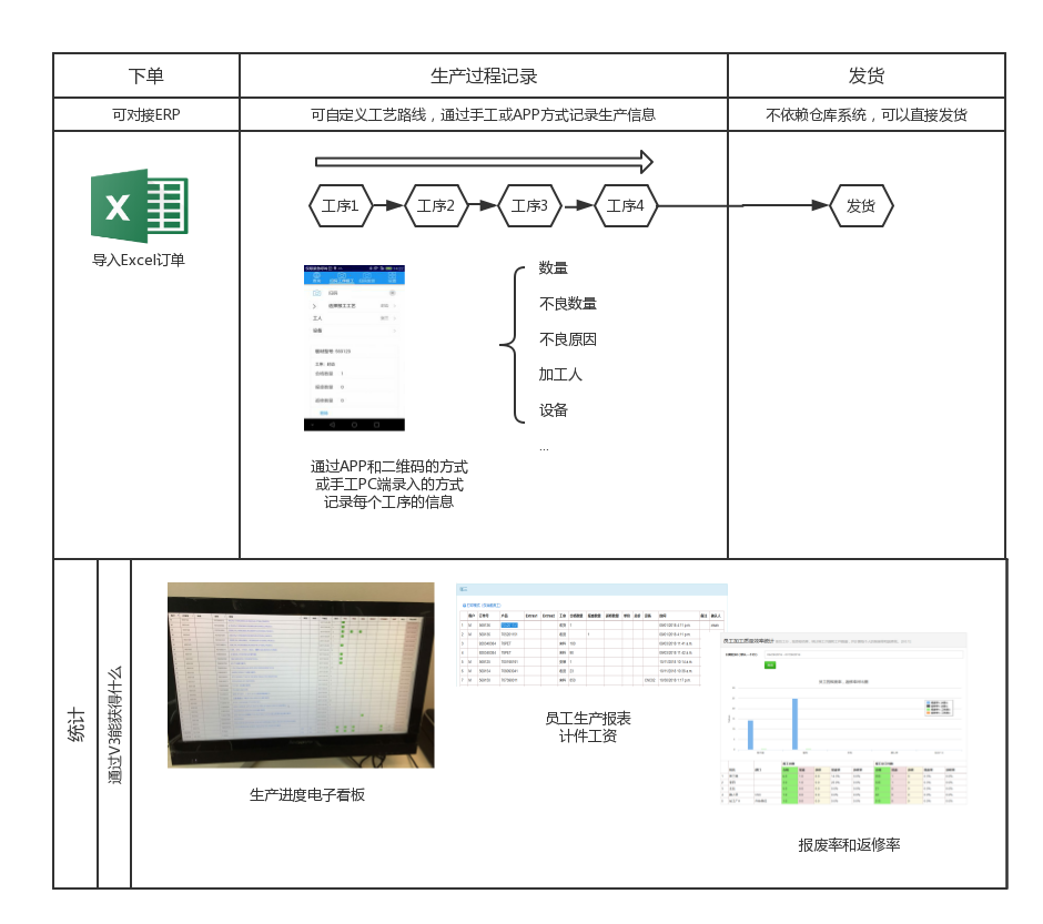 - 工序產出報工:支持電腦端,PAD,手機APP和PDA