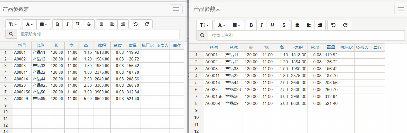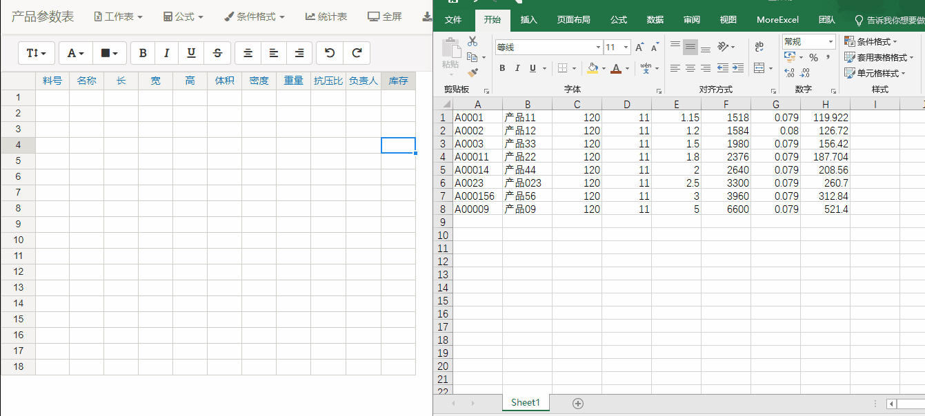 因为MoreExcel支持结构化表格,所以它不能直接在某个单元格上写公式,我们需要在列上面设计公式。下面用一个列子来说明:还是使用“产品参数表”(上图),用公式:长高=体积,体积*密度=重量,来得出体积列和重量列的数据,并做重量合计。