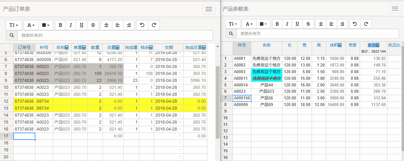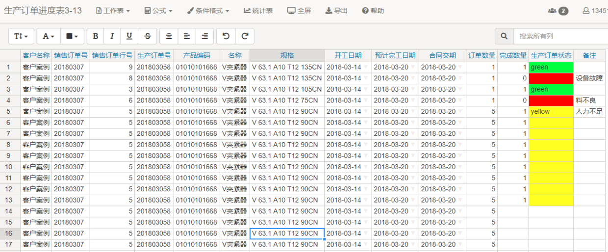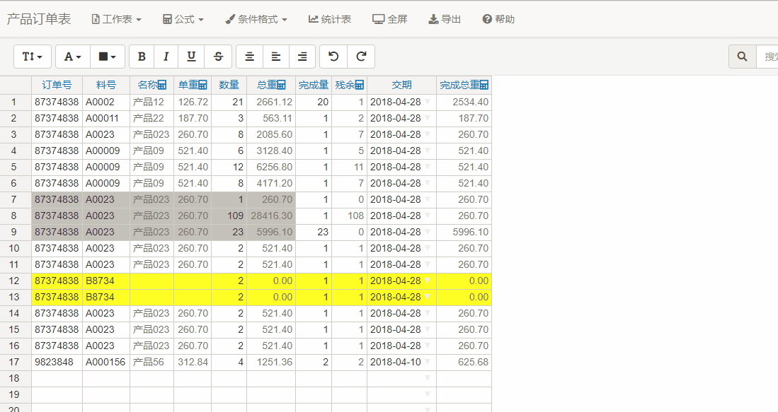 表格上需要自动标记颜色,类似于Excel的条件表达式。用“产品订单表”为例,我们来自动标记一下,订单数量完成的标记绿色(残数列是0)